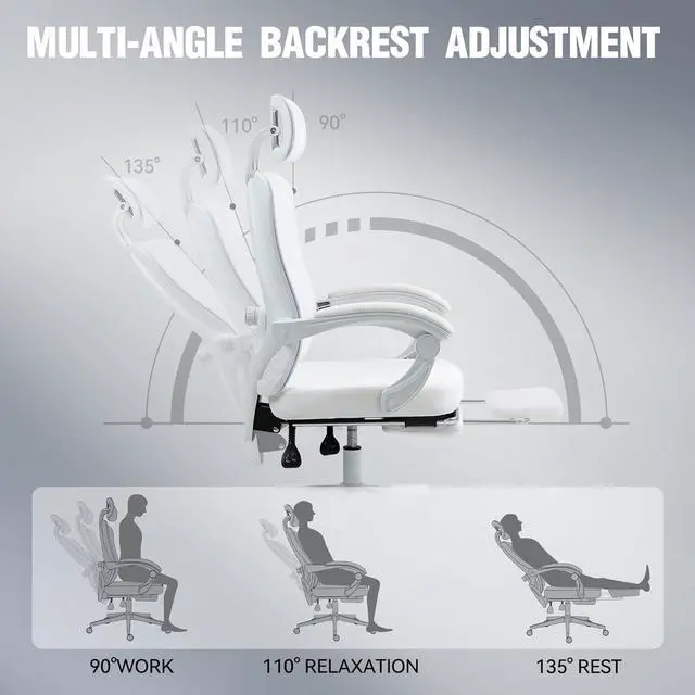 Versatile and Sturdy Design: Enjoy seamless mobility with the smooth-rolling wheels and 360° swivel base, perfect for navigating hard floors. Built to support up to 300 pounds, this chair offers both durability and comfort. The adjustable backrest reclines up to 135°, with retractable footrest, allowing you to find your ideal position for relaxation or focus.