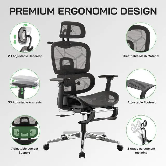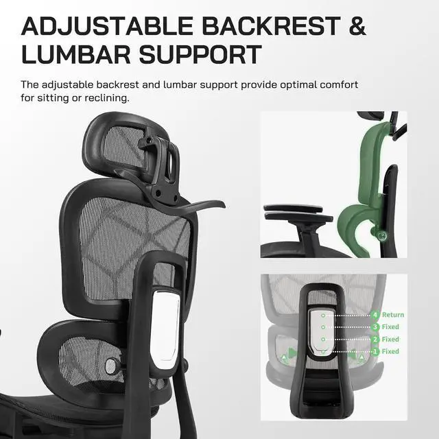 Ergonomic Mesh Office Chair: This fully-mesh office chair is designed with ergonomics in mind and offers multiple adjustments. The backrest adopts a bionic spinal curve design that fits the natural forward convex curve of the lumbar spine, providing even support for the lower back and reducing the pressure caused by the lumbar spine being suspended during prolonged sitting.