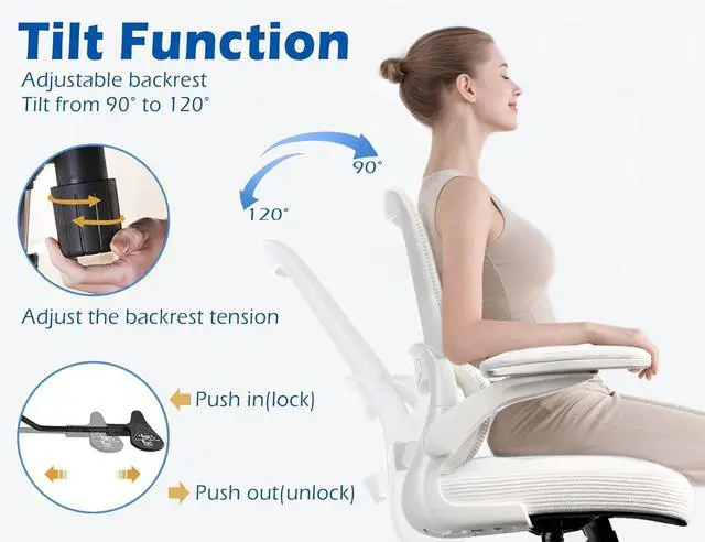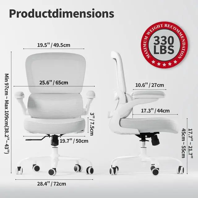 ERGONOMIC SUPPORT: TRALT ergonomic office chair for back pain relief is a desk chair comfy enough for long hours, featuring adjustable lumbar support to promote natural posture. A wider seat (20" W x 17.3 " D x 18.5 " - 21.3 " H) helps distribute weight evenly, suitable for people of about 5' 5" to 6' 2". Flip-up armrests make it a comfy chair for small spaces