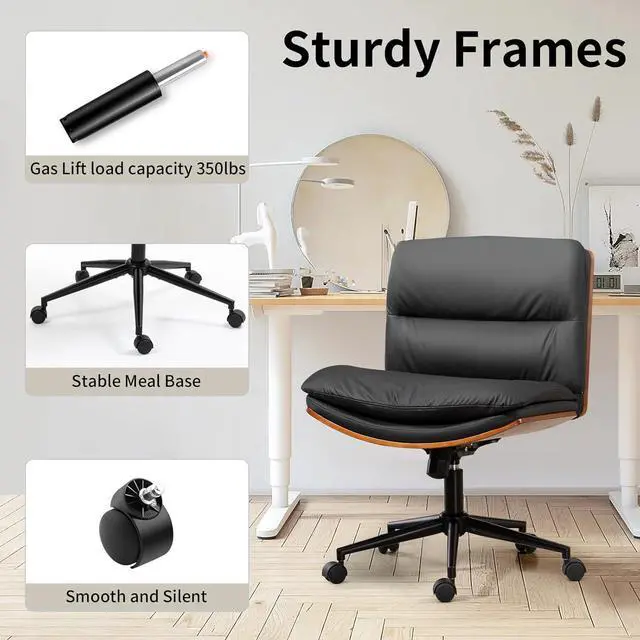 Armless Modern Walnut Office Desk Chair with Wheels, PU Leather Adjustable Wide Swivel Task Chair, Ergonomic Cross Legged Computer Chair for Conference Room, Home Office (Black)