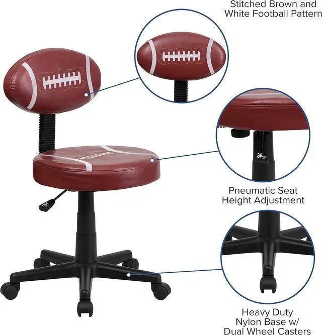 [_Our chair conforms to ANSI/BIFMA standard X 5.1 -17_] Round vinyl upholstered seat with CAL 117 fire retardant foam featuring a football shaped back with brown and white football pattern