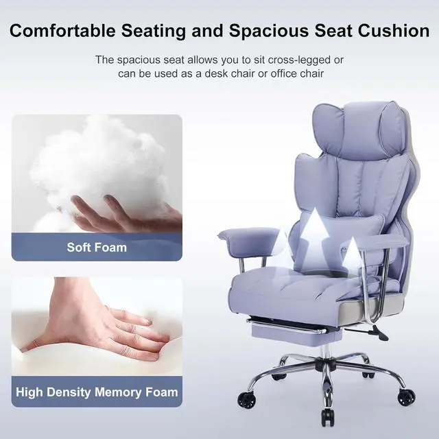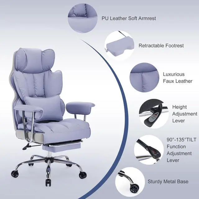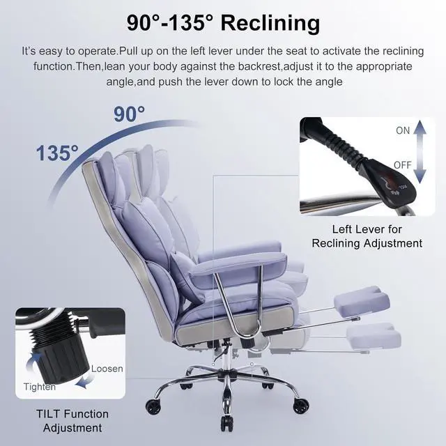 MULTI-FUNCTIONAL EXECUTIVE OFFICE CHAIR: The office chair features a 360°swivel base for effortless movement, adjustable height settings, and a tilt/swivel system allowing you to customize the backrest angle up to 135°for unparalleled comfort. Additionally, the large office chair includes a retractable footrest, saving space while offering comfortable foot support whenever needed. The big and tall office chair also doubles as a great computer chair or gaming chair with foot rest.