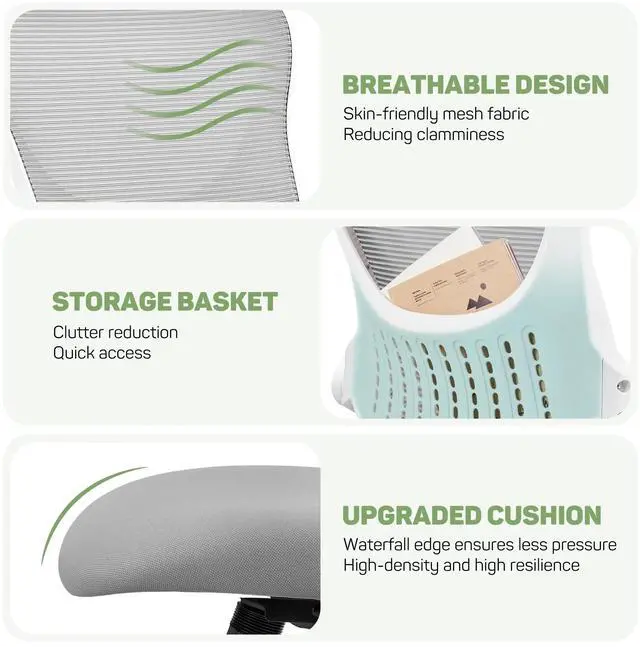 • All-Day Comfort: Ergonomic mesh back, thick seat cushion, and adjustable headrest provide support and breathability for long hours of use.