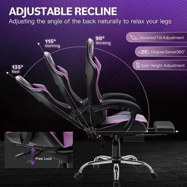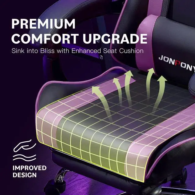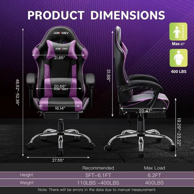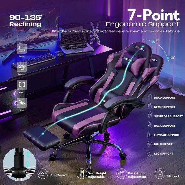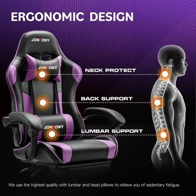 JONPONY Big and Tall Gaming Chair, Ergonomic Design, Gamer Chair PU Leather with Footrest and Lumbar Support, High Back Office Chair Support 8 Hours Long Sitting, Computer Chair Purple