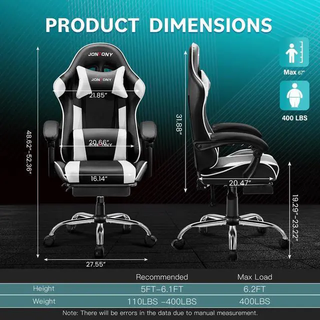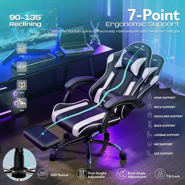 JONPONY Big and Tall Gaming Chair, Ergonomic Design, Gamer Chair PU Leather with Footrest and Lumbar Support, High Back Office Chair Support 8 Hours Long Sitting, Computer Chair White