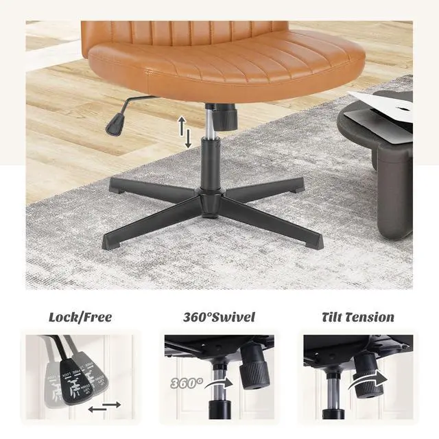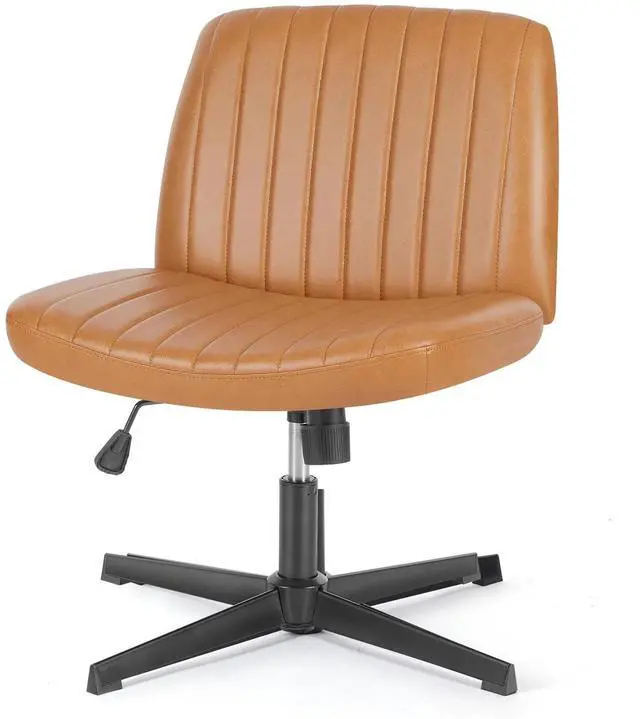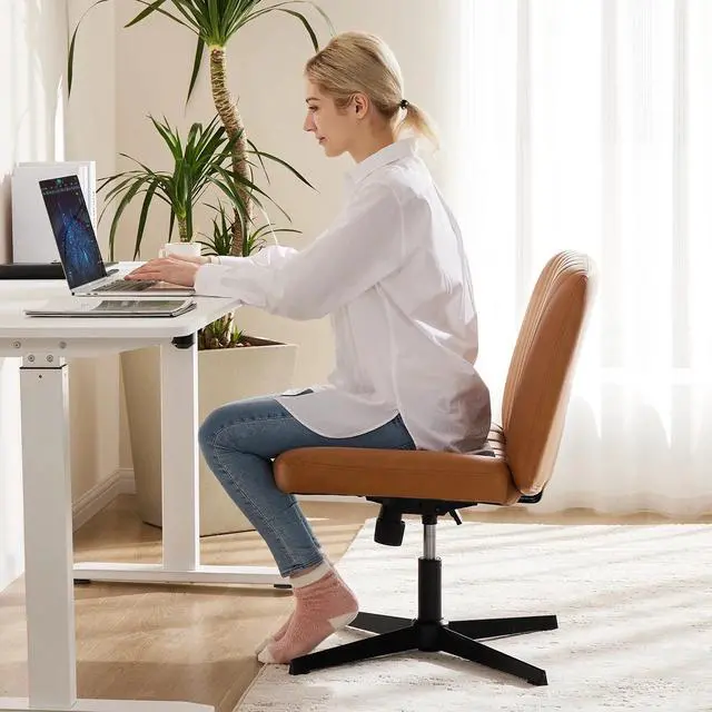 Office Chair Armless Criss Cross Legged Chair No Wheels, Comfy Home Office Desk Chairs, Adjustable Swivel Padded Fabric Vanity Task Computer Chair PU+PVC - Brown
