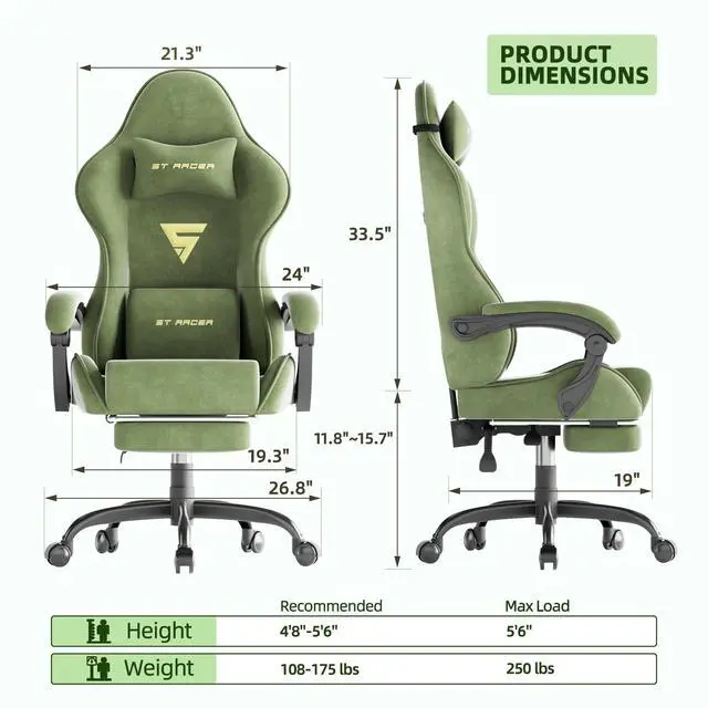 SOONTRANS Gaming Chair for Adult, Velvet Fabric High Back Gamer Game Chair with Footrest, Ergonomic Comfortable Computer Office Chair with Massage Lumbar Cushion, Reclining Leather Desk Chair, Green