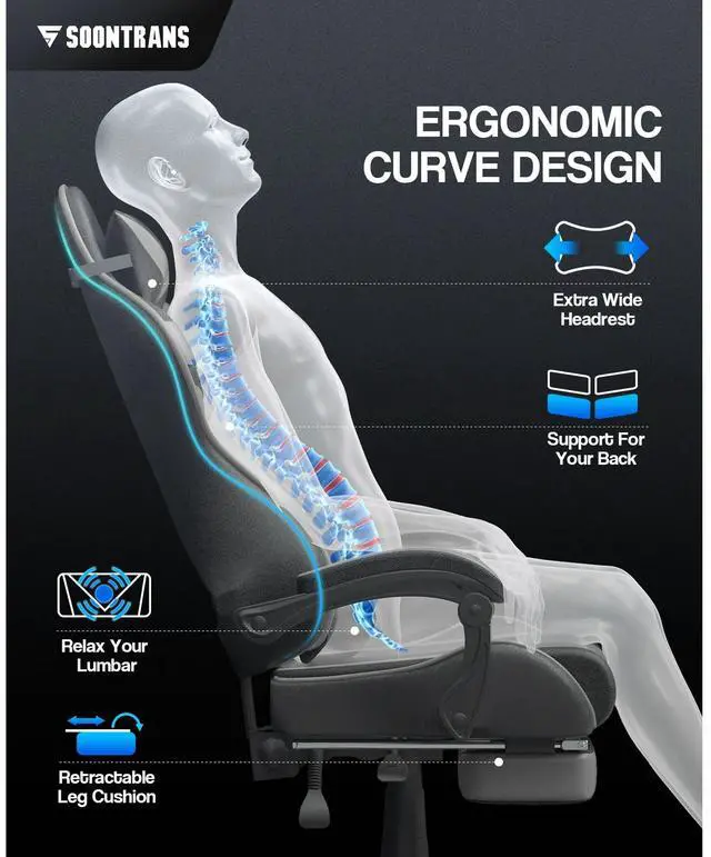 Ergonomic Comfort Support: Features high-density foam, a removable headrest, a massage lumbar pillow, and synchronized armrests, designed to fit the spine's natural curvature for prolonged use.
