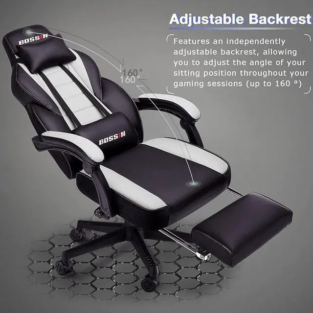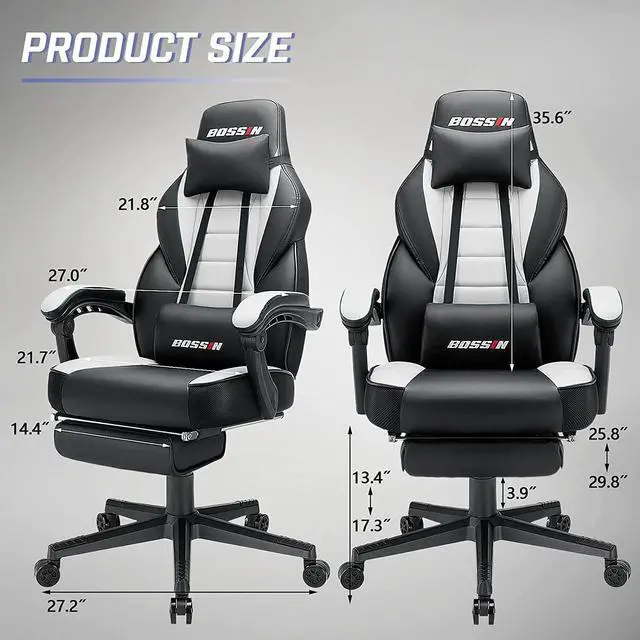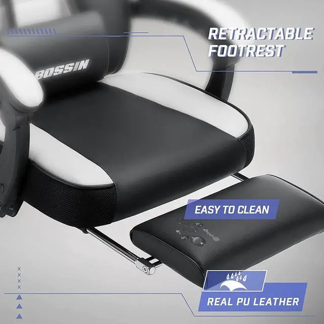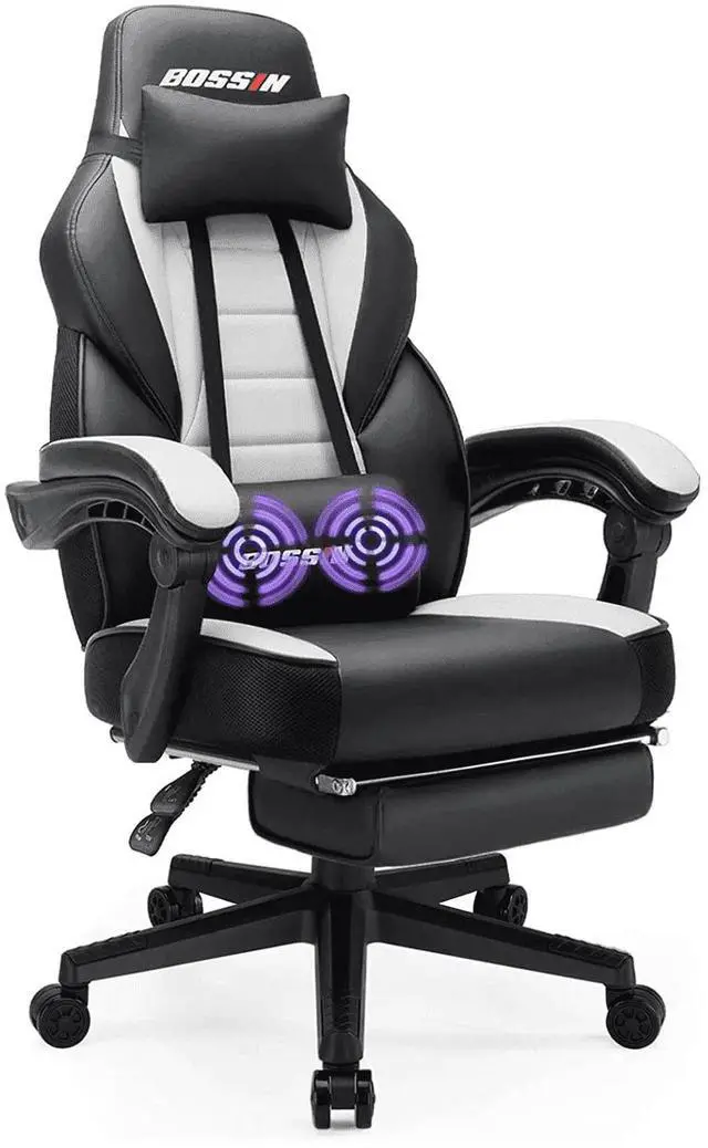 Bossin Gaming Chairs with Footrest, Massage Leather Game Chair for Adults, Big and Tall Gamer Chair with Headrest and Lumbar Support White