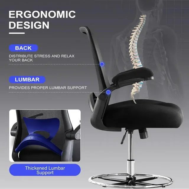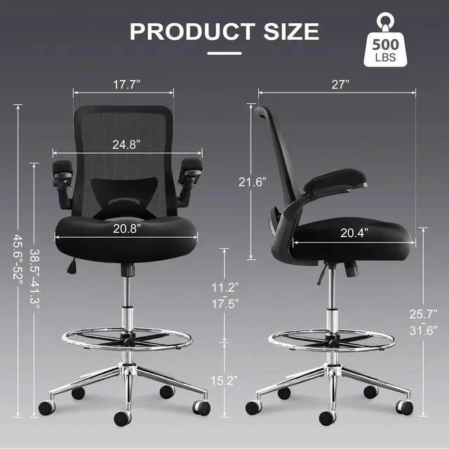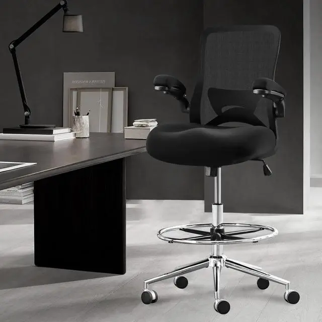 Thicker Seat for More Comfort The tall drafting chair for standing desk features a breathable mesh backrest and a 20.8 inches wide high-density foam seat cushion that conforms perfectly to the spine. High resilience and high density sponge is durable and not easy to deform for long-time use.