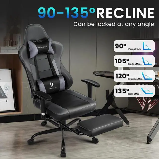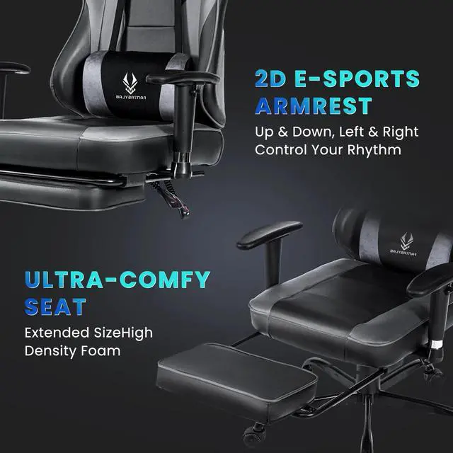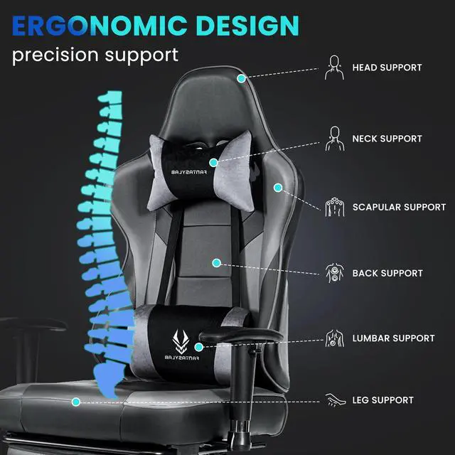 TOP-TIER GAMING CHAIR Transform your gaming sessions with this racing-style gaming chair, crafted with ergonomics in mind. The seat cushion is equipped with memory foam padding, delivering unparalleled comfort for those marathon gaming stretches. The chair's tall back and cushioned armrests offer superior support, conforming to the natural contours of your body. The high backrest, complete with detachable padded headrest and lumbar cushions, provides crucial support for your neck and spine, helping you avoid the notorious "computer slouch."