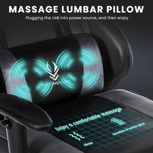 Exceptional Comfort The lumbar cushion of this chair is ingeniously designed to be connected to a vibration massage power source, effectively alleviating fatigue and significantly enhancing the overall user experience. Moreover, both the headrest and the detachable lumbar pillow offer versatile position adjustments, ensuring optimal comfort tailored to your preferences.