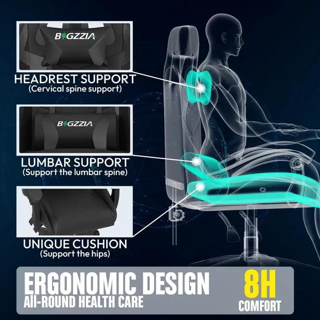 Ergonomic Design: Adjustable headrest and lumbar pillow, 90-155 degree reclining backrest, linkaged armrests, and 4-inch height adjustment for personalized comfort.
