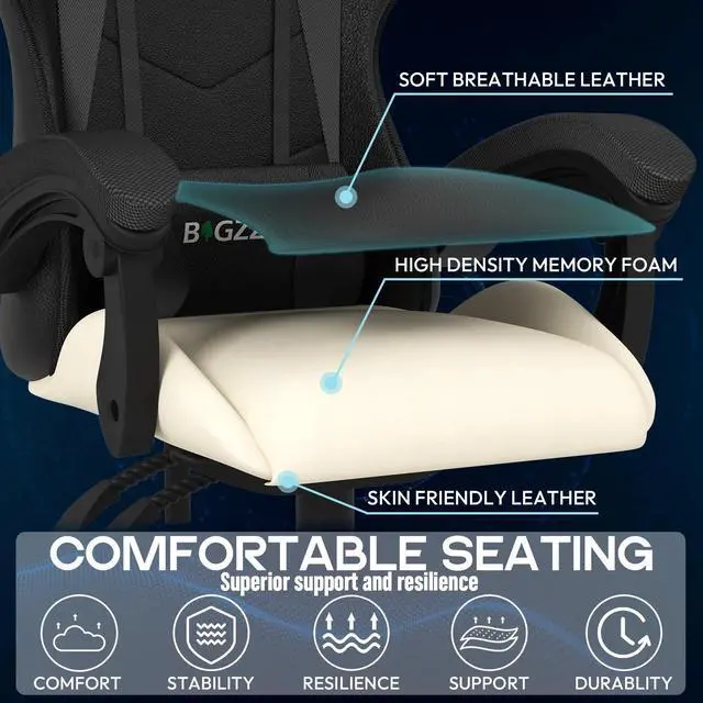 High quality Leather Material Gaming Chair: Soft and Skin-friendly leather material that resistant to scratches, stains, peeling and cracking, while also being breathable, and easy to clean. High-density foam cushion ensure a comfy seating experience, that will retain its form after long periods of use.