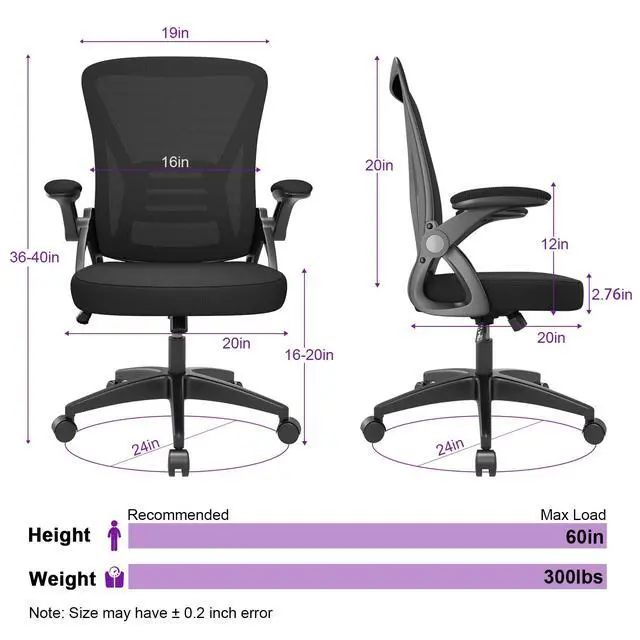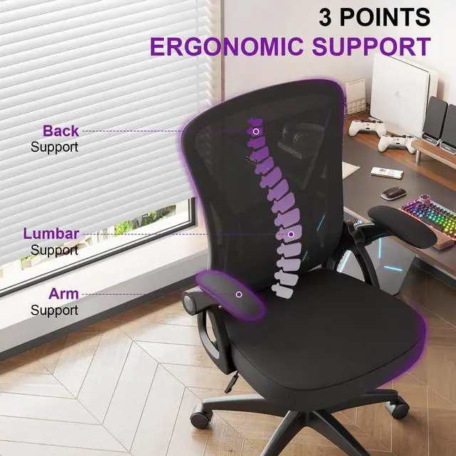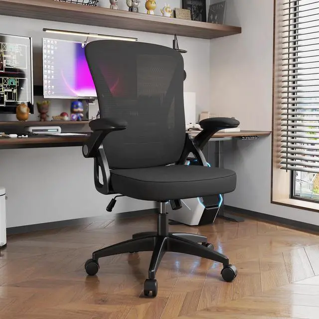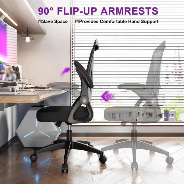 Bigzzia Ergonomic Office Chair, Mid-Back, Adjustable Height, Flip-Up Arms and Lumbar Support, Black
