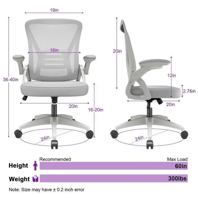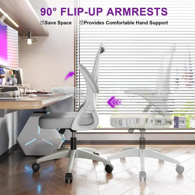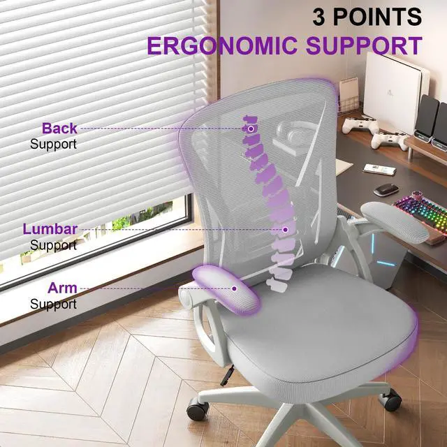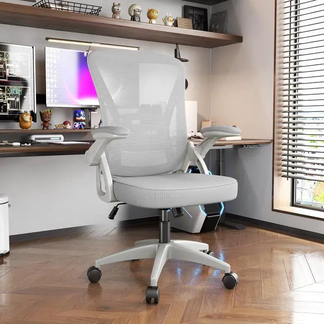 Biggzia Ergonomic Office Chair, Mid-Back Computer Chair with Adjustable Height, Flip-Up Arms and Lumbar Support, Mesh Desk Chair, Gray