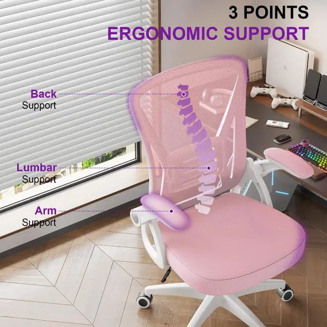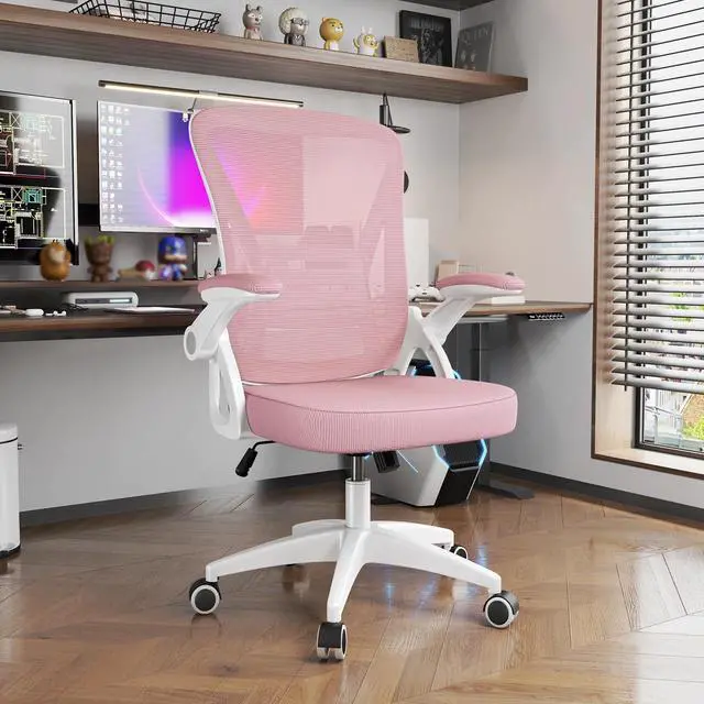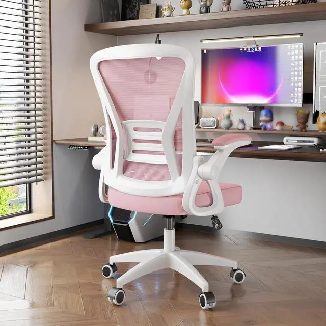Biggzia Ergonomic Office Chair, Mid-Back Computer Chair with Adjustable Height, Flip-Up Arms and Lumbar Support, Mesh Desk Chair, Pink