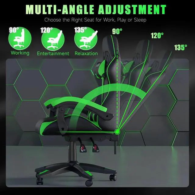 : Equipped with headrest and massage lumbar pillow.When your neck feels sore from gaming or working with head down for a long time,the headrest will relieve your fatigue.When tired from maintaining a same sitting posture,please rest assured to lean back and charge your waist pillow,it will relax your tired waist energetically.