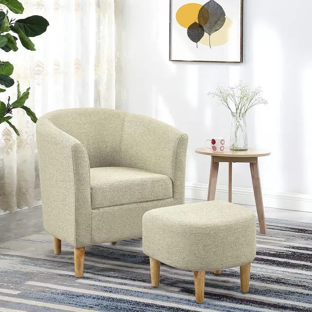 Vintage Charm and Sturdiness Combined: DAZONE presents retro-inspired sturdy barrel chair with ottoman designed to enhance your space room. Crafted with solid wood legs, a sturdy wooden frame and soft sponge padding, this beige accent side chair for living room ensure durability, stability and comfort. It' s the perfect reading chair for your cozy corner