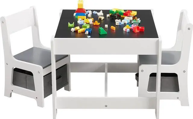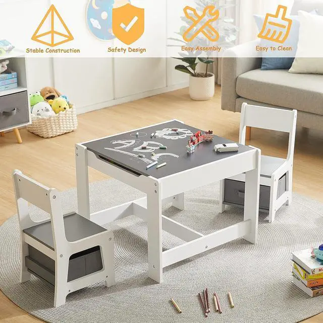 3 IN 1 TABLE & CHAIRS SET - Easy-to-clean acrylic panel on the front for drawing and scribbling with paintbrushs. On the reverse side is a chalk board that children can create on their own to improve their imaginations. Kids can play with toys, build blocks or make crafts with friends after removing the desktop. This 3 in 1 Table & Chairs Set perfect for kids to read, play, draw, snack, learn, and unleash their creativity.