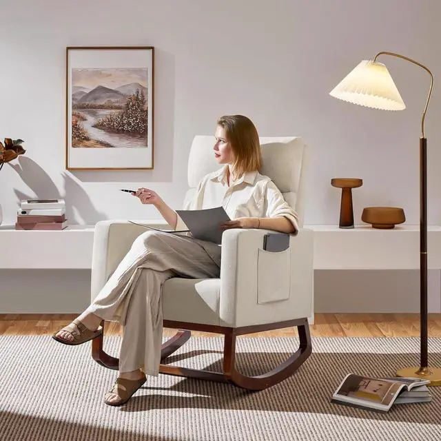 Side Pocket & anti-tipping stopper: The rocking chair with side pocket keeps your recently read books or magazines close at hand, creating a perfect reading nook for you. The installed plastic stoppers at the ends of chair legs prevent you from tipping backward.