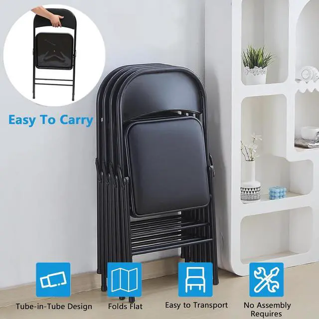 Dimensions: 18" D x 18" W x 31" H, Our folding chairs 4 pack are dependable and sturdy, ideal for use in Bedroom, Dorm Rooms, Apartments, Lounging, Garden. This black folding chairs are pre-assembled and can be used directly. our classic " Y-frame" enforced with double-riveted front and rear leg cross braces, and double hinges on each side for added stability.