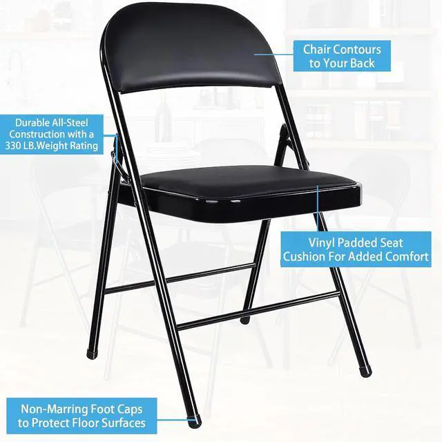 EASY TO FOLD & NO NEED TO INSTALL: The folding chair package includes folding chairs 4 pack, folded up for easy storage, the padded folding chairs 4 pack is all steel structure with double hinges, welded cross braces, the foldable steel frame can support up to 330 lbs, allowing the folding chair to Folding flat when not in use, the folding chair has hinges on each side for added stability.