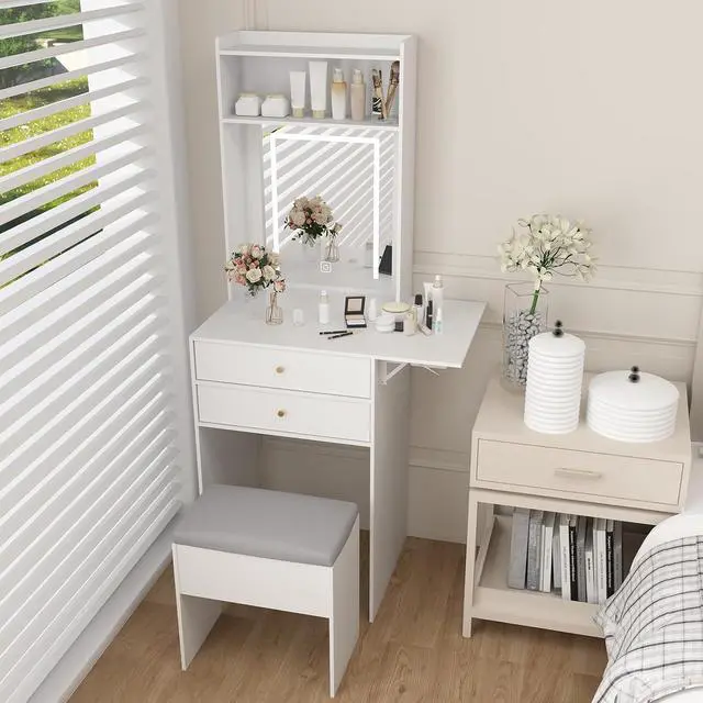 Additional Space: Apart from with mirror lights and chairs, this vanity table also has a side panel that can be folded and opened, even if it is a small dressing table, it also gives you enough space to make up