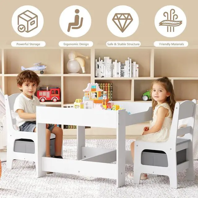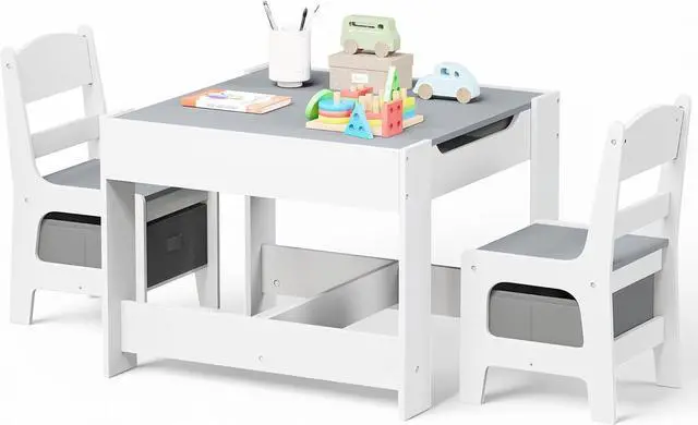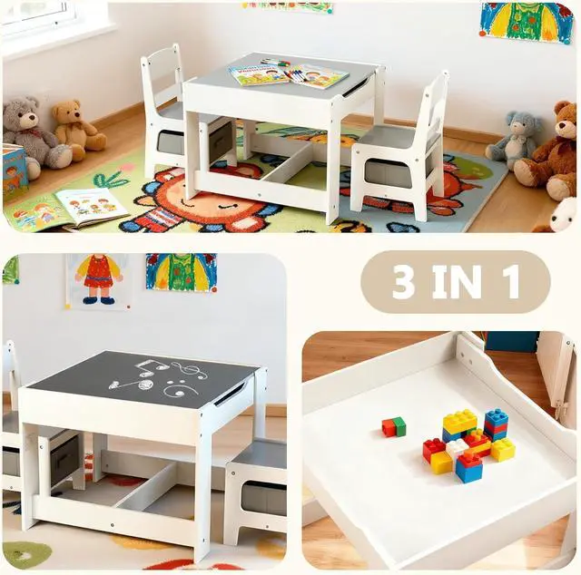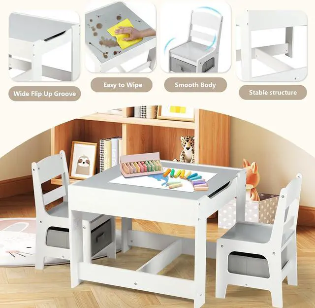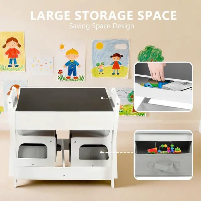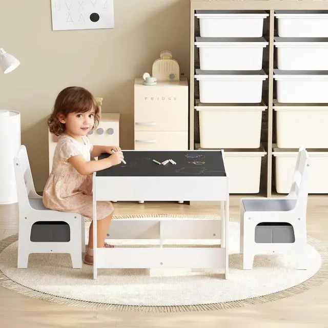 Table & Chairs Set: The whiteboard for reading, playing, snack time or distance learning; The chalk board for improving kids imaginations; Play with toys, build blocks or make crafts after removing the desktops