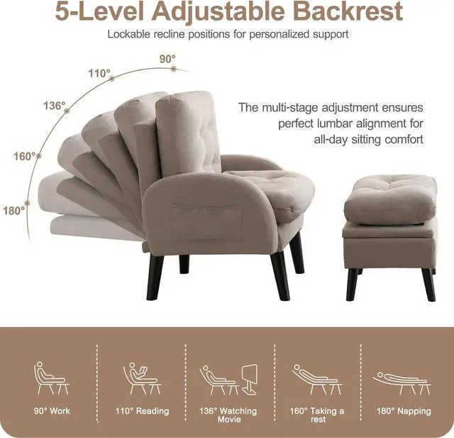 5-Position Adjustable BackrestThis lazy chair uses an adjustable backrest, 5 stage adjustable backrest 90°-180°. You can find the perfect position to sit and relax after a long time work, enjoy the comfortable experience and fun brought by the reclining chair.