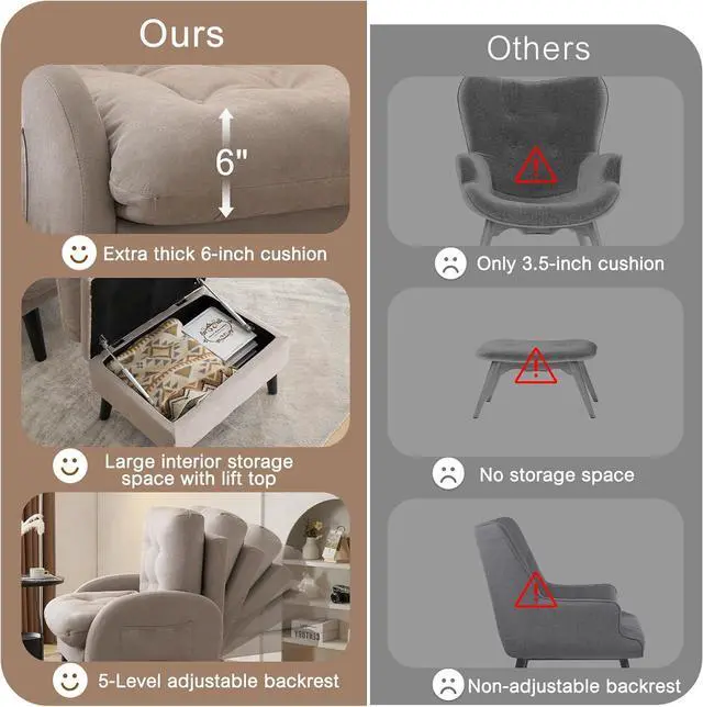 Storage Ottoman FunctionOur living room chair comes with a matching storage ottoman has a large interior storage space and lift top, it can store blankets, books and other sundries. Sitting on the sofa and putting your feet on the ottoman can relax your legs, relax your whole body and enjoy the pleasant time.