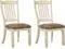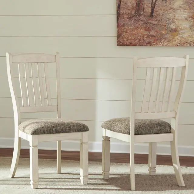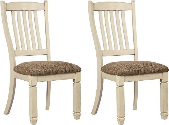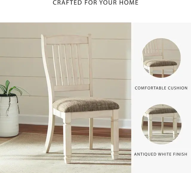 BEAUTIFULLY CRAFTED: Chairs are made of solid wood in a textured antique white finish. Seats are upholstered in a heavy woven fabric