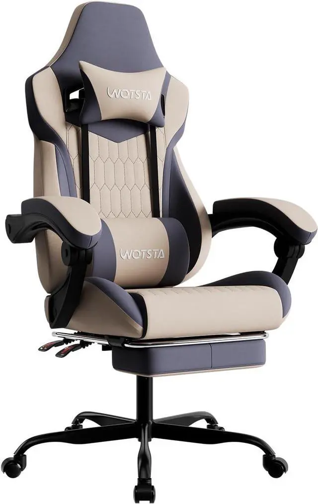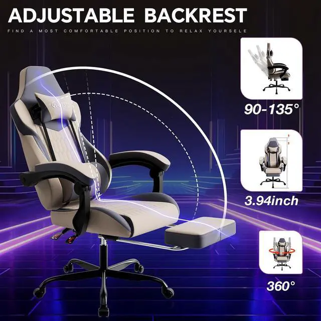 Ergonomic Design for All-Day Comfort & SupportConquer long gaming sessions or workdays with confidence! Our chair is meticulously engineered to support your body' s natural curve. The adjustable headrest and included lumbar massage pillow target key pressure points at your head, shoulders, waist, and hips, transforming your desk into a haven of comfort and helping you maintain focus and posture for hours on end.