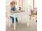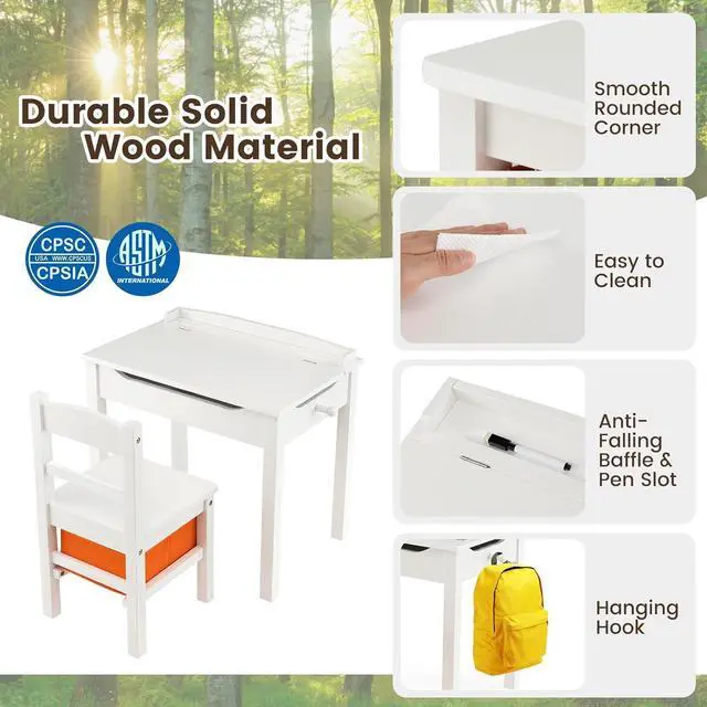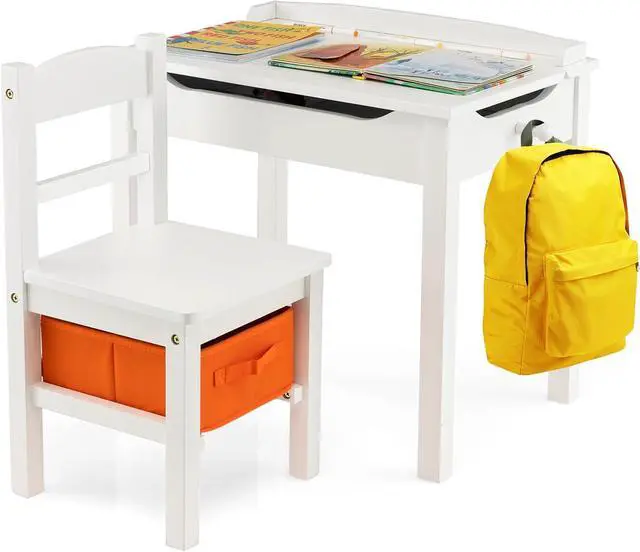 Kids Table & Chair Set with StorageThis kids study table is featured with flip-top design and the chair comes with a non-woven fabric drawer, which creates additional storage space for stationery, toys, books and more. The slow-dropping hinge can prevent sudden closing while the groove under tabletop avoids pinching hands.