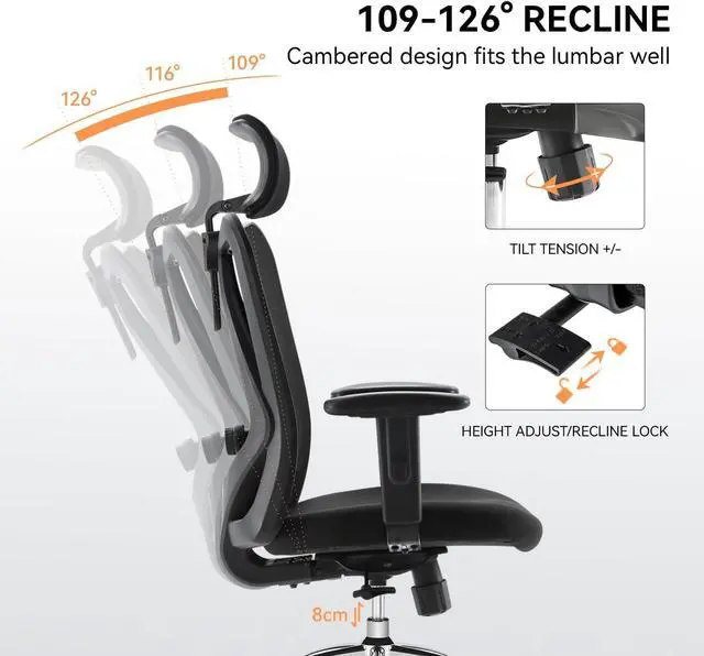 Adjustable FunctionCompared to other desk chairs, we are more adjustable. 3.93 inch stepless height adjustment, 126° super-angle backrest tilt, PU lift armrest and adjustable headrest. Find the most comfortable sitting position for you.
