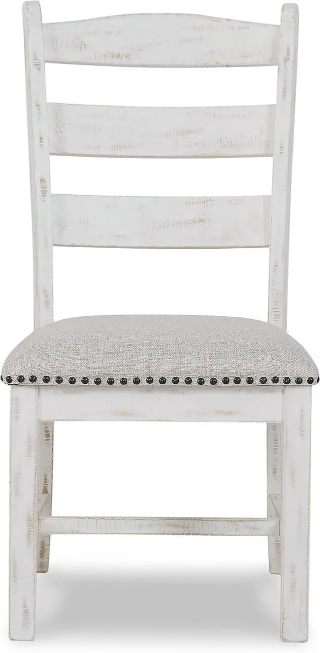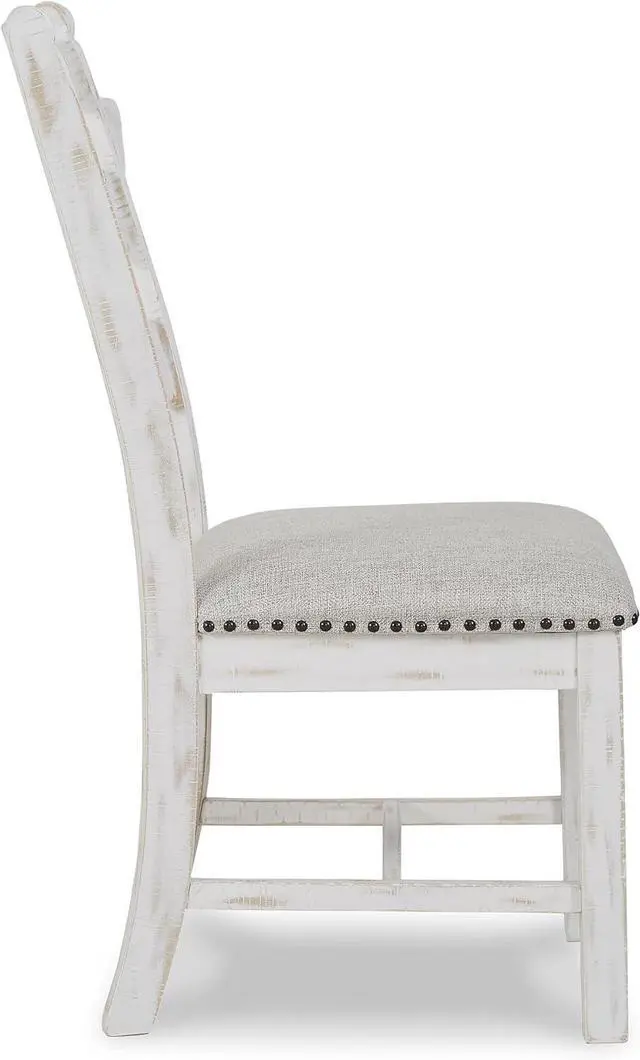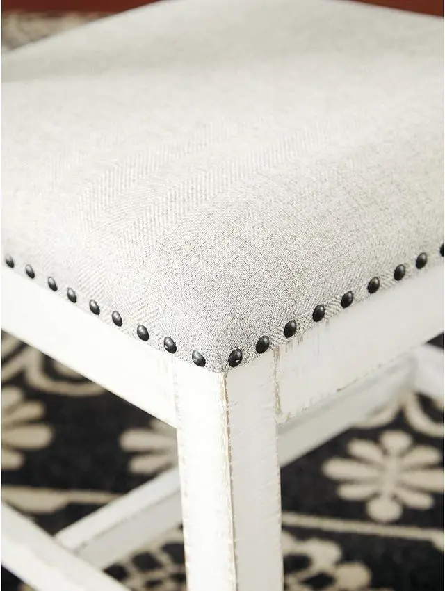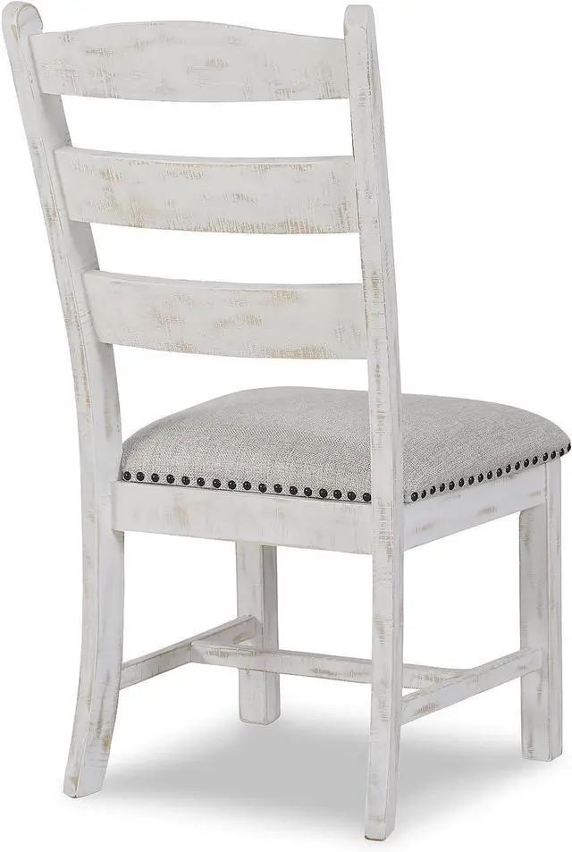 UNIQUELY CRAFTED: Made of solid wood with a distressed white vintage finish and a cushioned seat upholstered with a linen-colored polyester fabric accented with nailhead trim