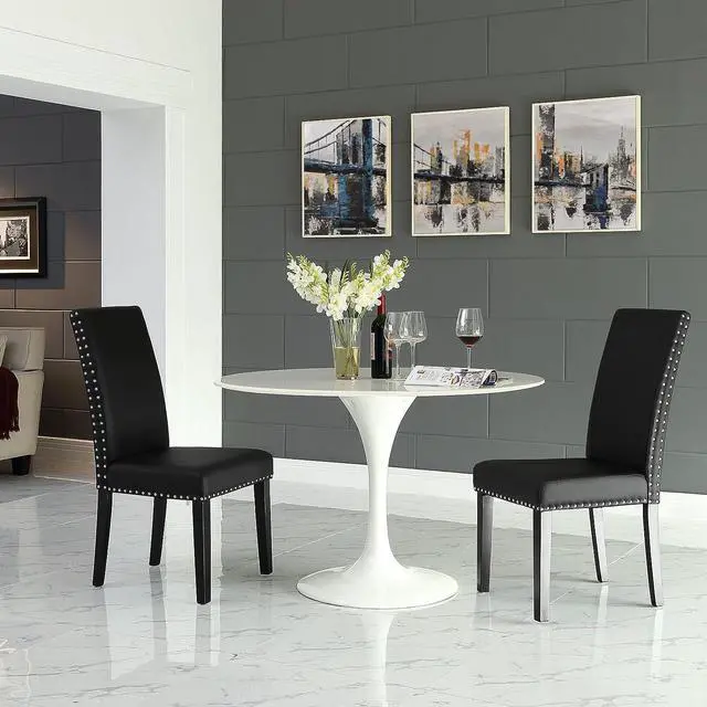 CONTEMPORARY STYLE - Boasting sweeping lines and a minimalist design, Parcel features smooth vinyl upholstery and wood legs with non-marking foot caps. Complement a variety of dining decors.