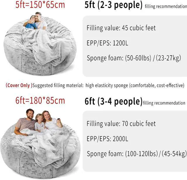 Giant Bean Bag Chair Cover: 5ft/150cm (diameter) = 59.06 x 59.06 x 25.59 inches, 6ft/180cm (diameter) = 70.86 x 70.86 x 33.46 inches. (Only Cover).
