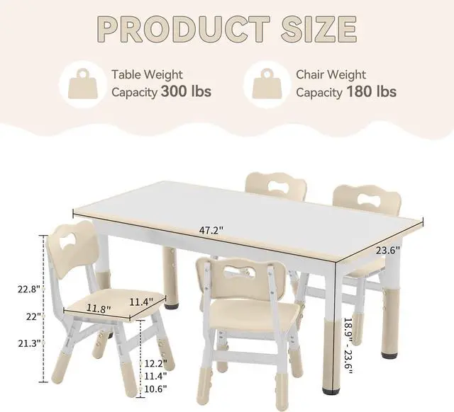 ADJUSTABLE HEIGHTHeight-adjustable toddler table and chair set specifically designed for children aged 3-8 years. The table adjusts between 7 height levels ( 18.9 " - 23.6 " ) and can hold up to 330 pounds; the chair adjusts 3 positions ( 10.6 " - 12.2 " ) and has a maximum load capacity of 180 pounds. Suitable for a variety of children' s activities.