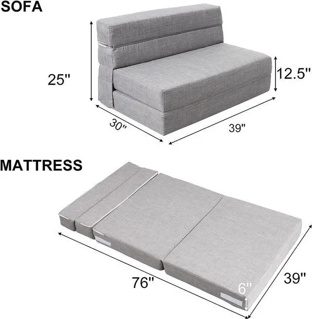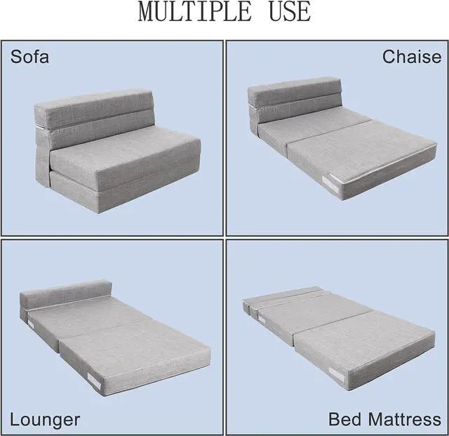 Premium Fabric & FoamBreathable fabric in light gray is durable and fashionable. High density memory foam triple fold down sofa bed is very comfy, soft with great support, so you won' t " sink in" or feel the hard floor.