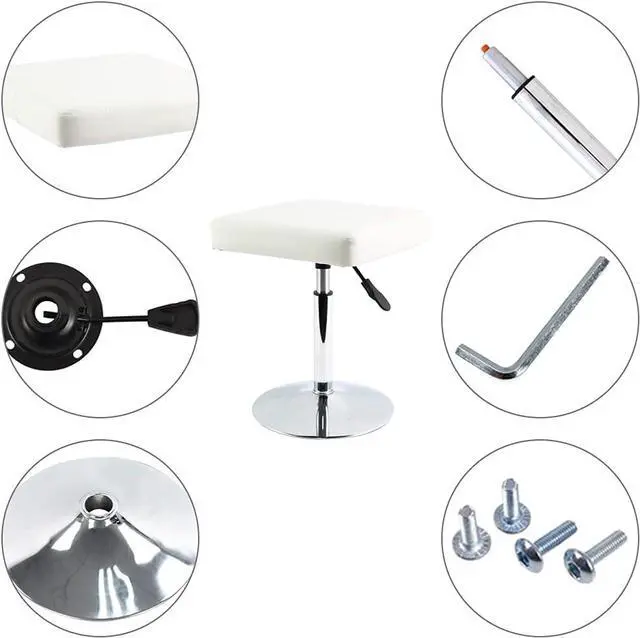 Material: Vanity stool seat is wrapped in PU leather, the base, footrest and cylinder are made of Steel, the height adjustment wrench is made of plastic.