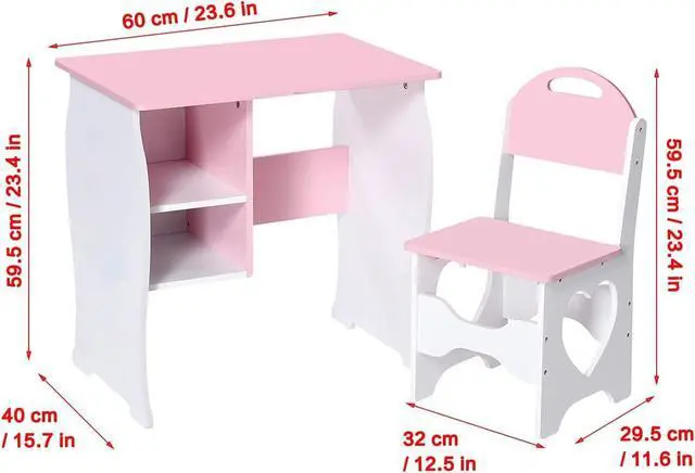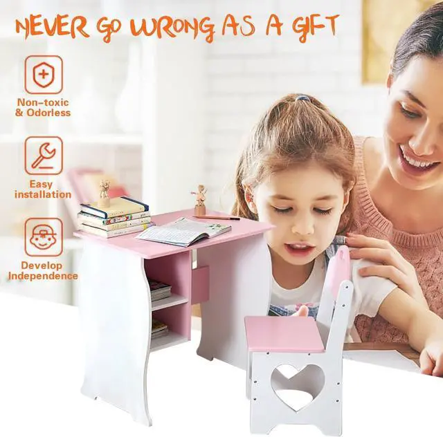 Simple & Stylish AppearanceWith the white and pink finish gives the shelf a classic and simple touch, and can fit any home style. The side of the table has a cute kitten pattern while the chair is uniquely designed with a hollow love design on both sides. The stylish appearance is suitable for different decorative styles of bedroom or playroom. Perfect child height.