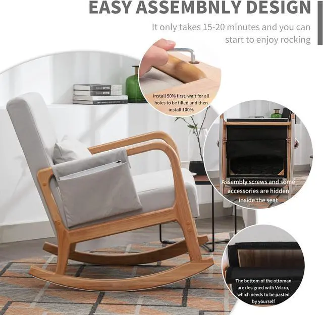 [ EASY ASSEMBLY ]: This rocking chair nursery, can be assembled by one or two people in 20 minutes. If you have any questions about the installation process, please feel free to contact us. Please find a clean floor to prevent the surface of the nursery rocking chairs from getting dirty before assembling.