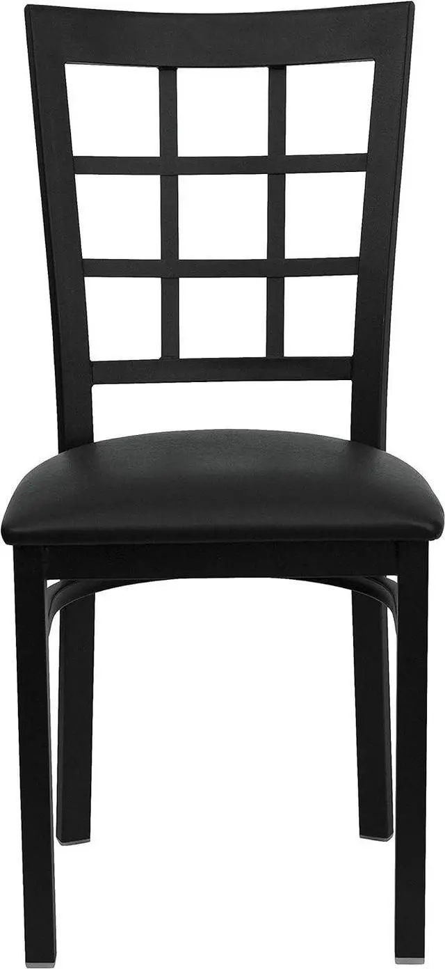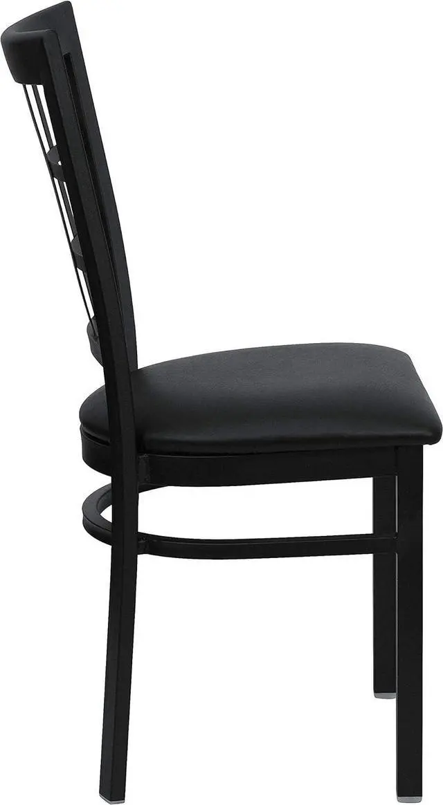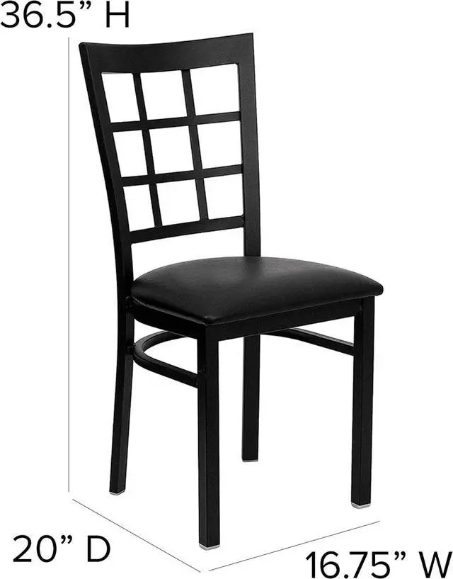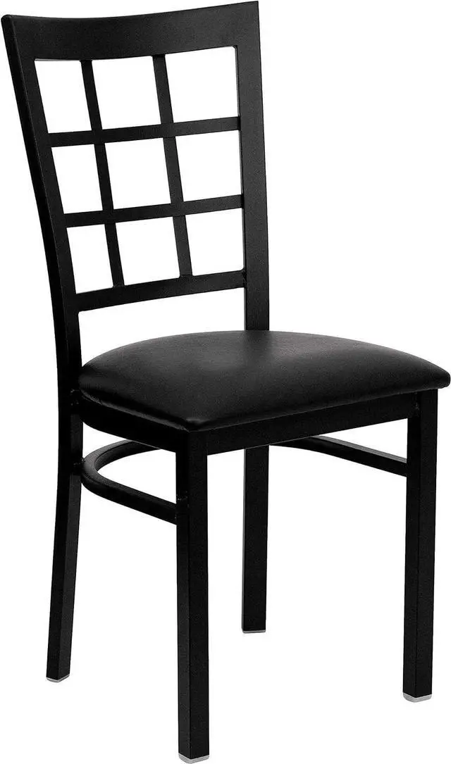 COMFORTABLE AND STYLISH: Boasting a window back design, black vinyl upholstery, and 2.5 " thick, foam padded seat, this dining chair is as comfortable as it is attractive, enhancing any establishment with on-trend style