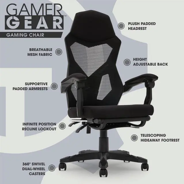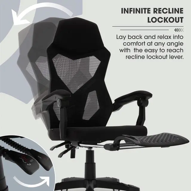The DIXSG Gaming Office Chair is built to support you whether for work or video gaming. The Mesh seat back is a durable, yet breathable material so you can feel supported, but also feel the breeze. The seat is generously padded for premium comfort that will last during a long gaming session or workday. A highlight of this chair is the fold up footrest. Anytime you need a break you can kick your feet up and relax. Underneath the chair you will find two easily accessible paddles for customizing your chair positioning. Use the Tilt/Tension paddle to customize the seat back support or adjust your seat height to get the chair to the ideal height for your knees. 5 caster wheels provide easy mobility to swiftly move around the room. The armrests are ergonomically positioned and generously padded to give you that added comfort and support you may need.