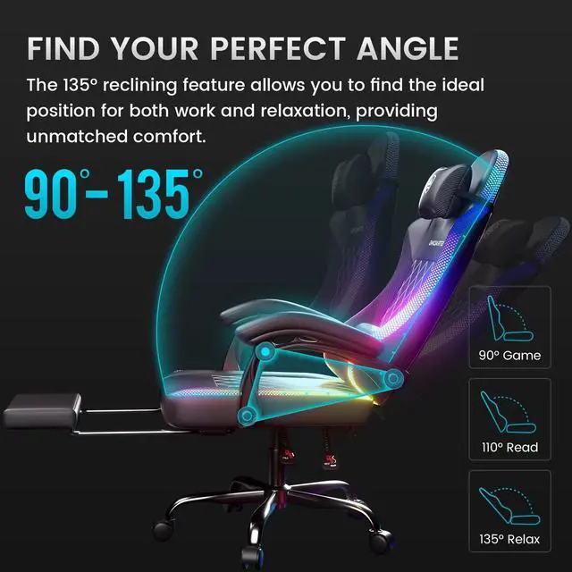The DIXSG RGB Gaming Chair combines modern style and comfort for an immersive gaming experience. With customizable RGB lighting, you can set the mood for your gaming sessions. The chair's massage function works on your back, lumbar, and neck, helping reduce tension and enhance circulation. Designed with an ergonomic touch, it offers exceptional support during prolonged sitting. The reclining feature allows you to lean back with ease, perfect for breaks during gaming marathons.