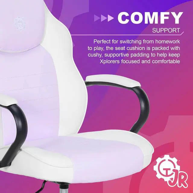 Adventure awaits! For little Xplorers with big imaginations, the Gamer Gear Jr. Xplorers gaming chair is the perfect sidekick for a smooth switch from homework to playtime. With bold color-block styling and SoftX upholstery, this chair is made to bring extra flair to any young gamers room! Comfort is key with the Xplorers supportive foam seat cushion and padded armrests shaped for a natural, comfy fit. Plus, with easy height adjustments and 360° swivel wheels, this chair grows right along with your junior gamer and keeps up with their every move. Deck out their desk area with the Gamer Gear Jr. Xplorer Chair, a serious gaming chair, perfectly sized for kids with big dreams.