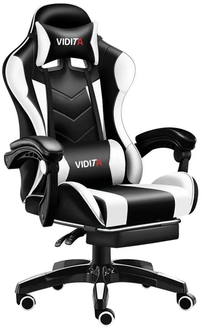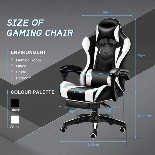 - Ergonomic Game Chair:Reclining backrest from 360°swivel design,100mm seat height adjust,retractable footrest,removable and adjustable headrest pillow and Lumbar Cushion for extra support.