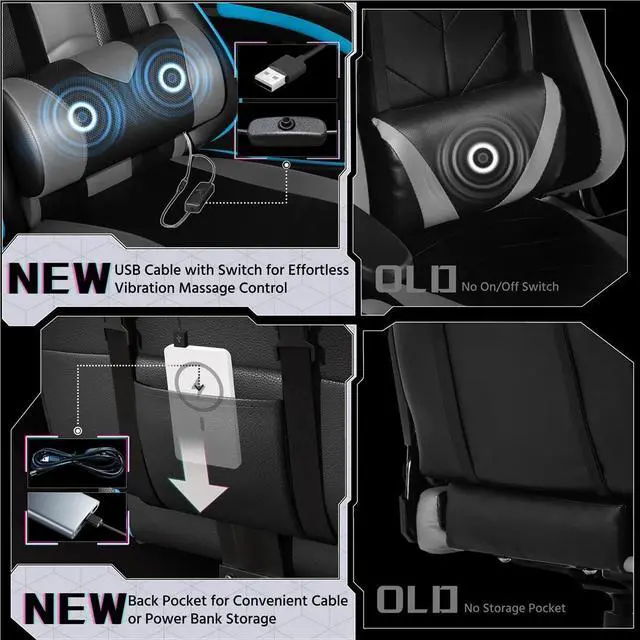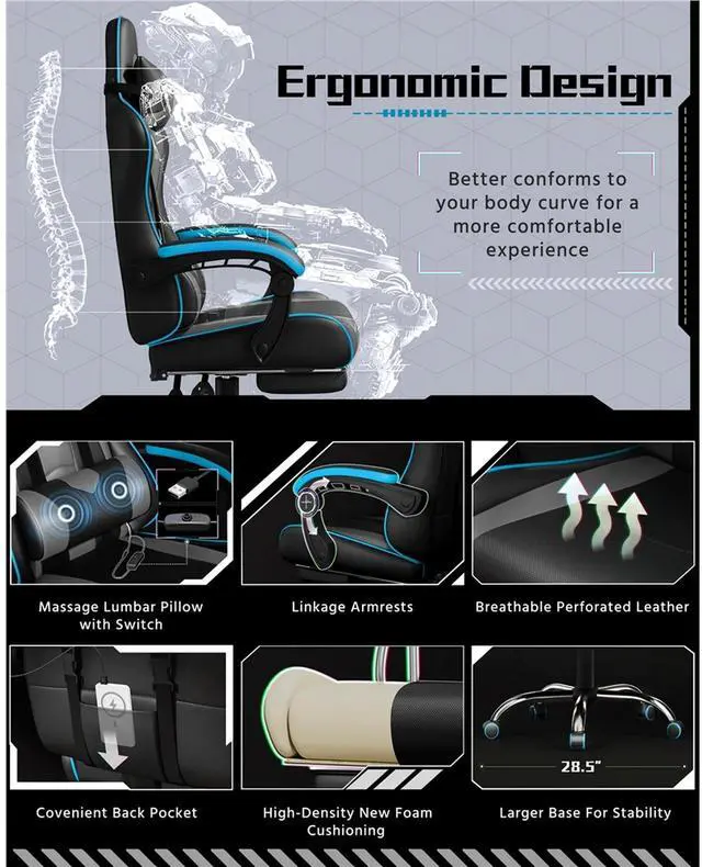 - Massage Lumbar Cushion and Extendable Footrest: The lumbar pillow includes a massage function activated by a USB switch to help ease fatigue, while the fold-out cushioned footrest provides added relaxation; a back pocket keeps the cable and small essentials organized