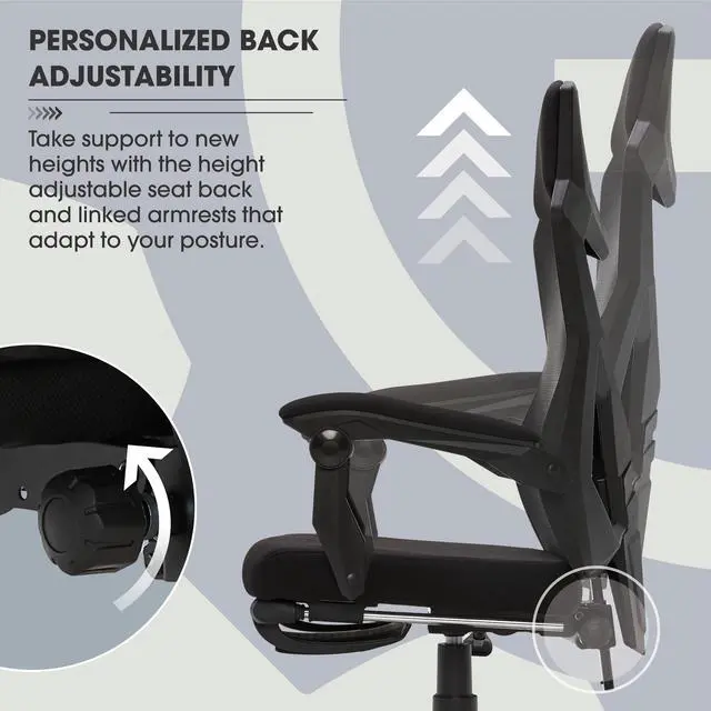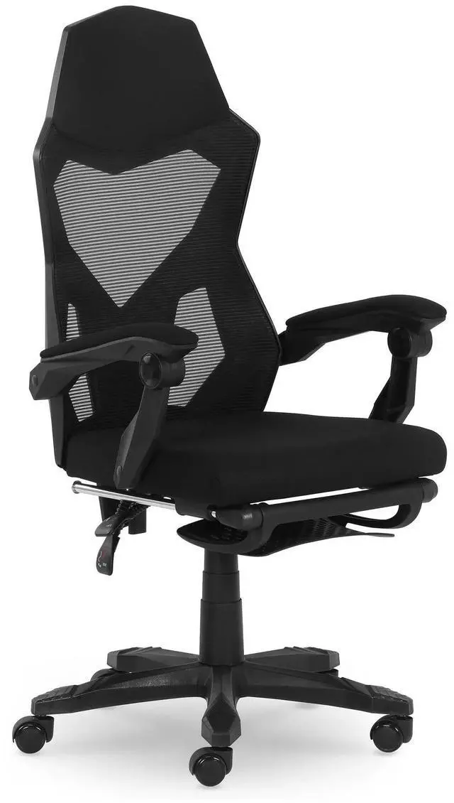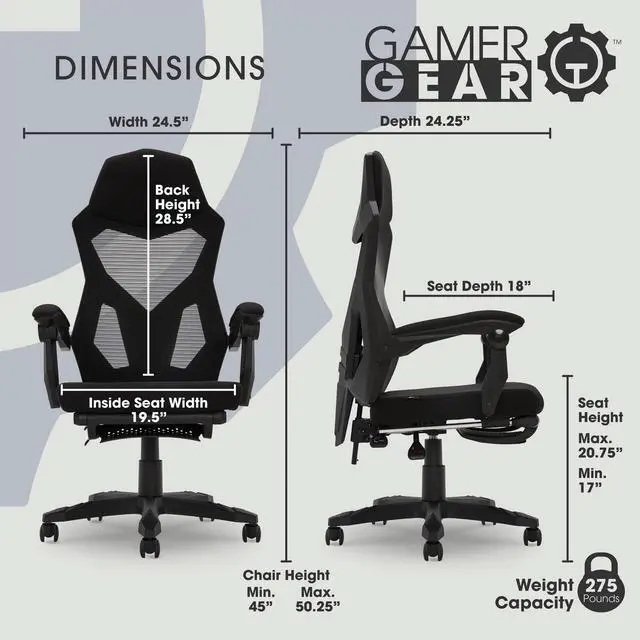 The DIXSG Gaming Office Chair is built to support you whether for work or video gaming. The Mesh seat back is a durable, yet breathable material so you can feel supported, but also feel the breeze. The seat is generously padded for premium comfort that will last during a long gaming session or workday. A highlight of this chair is the fold up footrest. Anytime you need a break you can kick your feet up and relax. Underneath the chair you will find two easily accessible paddles for customizing your chair positioning. Use the Tilt/Tension paddle to customize the seat back support or adjust your seat height to get the chair to the ideal height for your knees. 5 caster wheels provide easy mobility to swiftly move around the room. The armrests are ergonomically positioned and generously padded to give you that added comfort and support you may need.